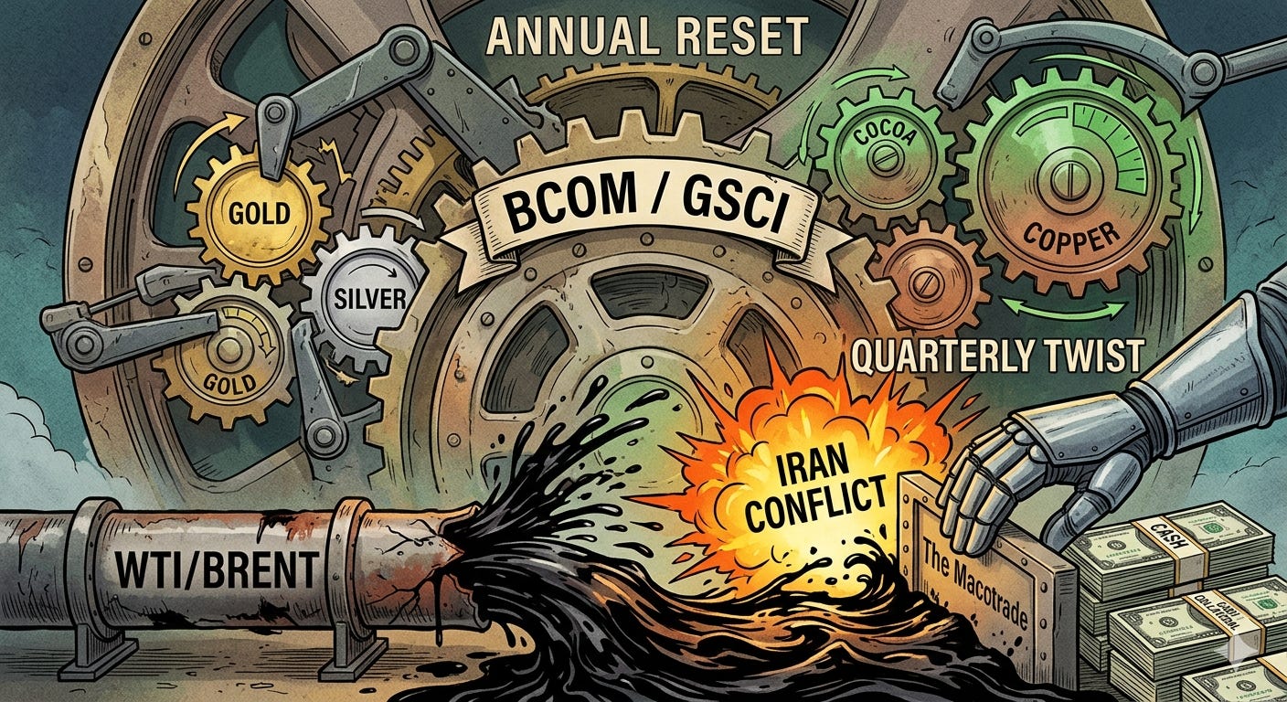 The Gold Paradox: Even though funds were “forced sellers” to bring Gold back down to its 14.90% BCOM cap, geopolitics kept a floor under prices. The theoretical dip didn’t materialize until the war on Iran began.